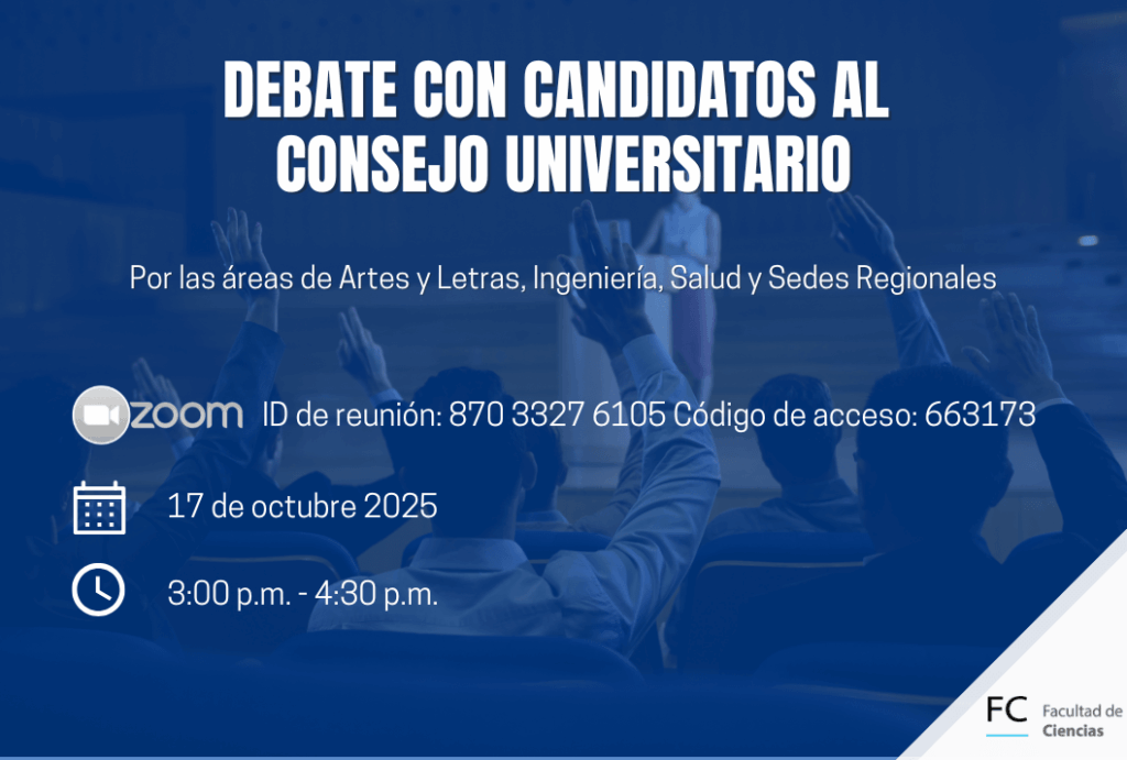 Les invitamos a un debate con las personas candidatas a representantes del sector académico ante el Consejo Universitario por las áreas de Artes y Letras, Ingeniería, Salud y Sedes Regionales, el próximo viernes 17 de octubre de 2025, de 3:00 a 4:30 p.m., en el auditorio de la Facultad de Ciencias.